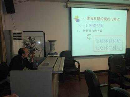 邢教授立足于当前体育科研发展的特点,首先从宏观层面阐释了当前体育科研研究类型、研究内容、学科分类研究、研究方法、科学思维方式以及发展趋势。然后,从微观层面采用典型的科研成果例证介绍了当前体育科研主要研究导向、选题的现状以及选题中存在的主要问题及原因等方面,分析了竞技体育科研和大众体育科研的现状与热点,并重点阐述当前体育科研的发展主流:一是多学科相互交叉和相互渗透的综合性研究将成为体育科学研究的发展主流;二是从定性研究向定量研究发展,或二者并重也将成为体育科学研究发展主流。三是从静态研究向动态研究发展,从横断面的一般性观察向纵向追踪观察研究,将成为体育科学研究发展主流;四是对大众体育、特别是关系民族体育与健康的研究也将成为主流。最后,邢教授指出了体育学科建设面临的主要挑战,同时从我们地方性本科院校体育学院实际出发,结合体育实践,画龙点睛的剖析了我们比较适合做哪些类型体育科学研究。