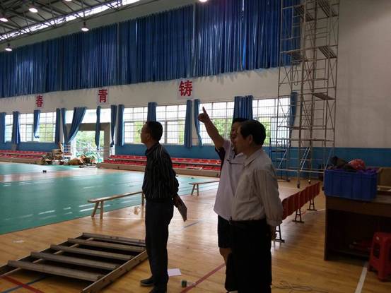 上午10:00,丁校长就早早的来到了训练馆,现场视察了训练馆的场地灯光、比赛场地胶安装,舞台的搭建、场地卫生,宣传橱窗等,并就有关的建议现场与体育学院院长唐吉平、后勤处处长刘贵芳进行了交流。