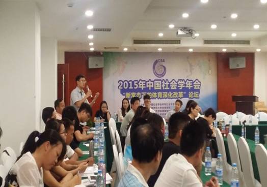 (通讯员 胡科)2015年中国社会学会“新常态下体育深化改革”论坛于7月10日至12日在湖南长沙举行。本次会议由中国社会学学会体育社会学专业委员会主办,湖南城市学院体育学院、湖南师范大学体育学院和华南师范大学民族体质与健康研究中心联合承办,会议以“新常态下的体育深化改革”为主题对新时期的体育发展、改革的热点、难点、重点问题进行了深入的探讨。