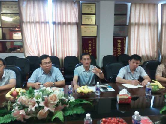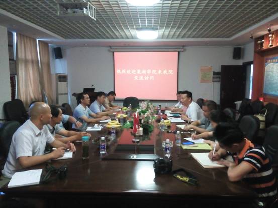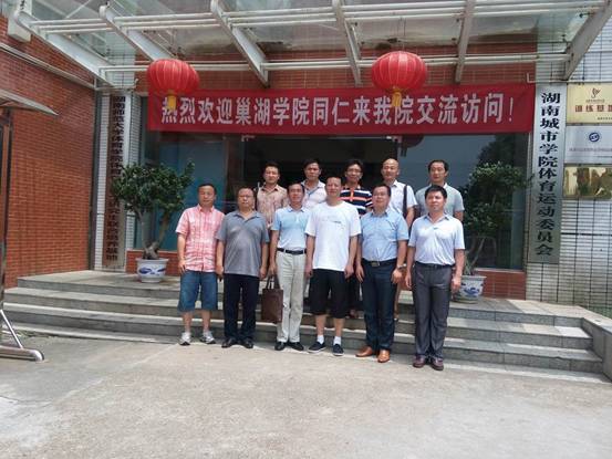 (通讯员 郭羽)2015年7月20日,巢湖学院体育学院院长姚磊、党总支书记周祥一行7人来我院考察交流。体育学院院长唐吉平、党总支书记熊兴吾、副院长刘鸥、副院长李志宏、党总支副书记郭羽、办公室主任王雄鹰、实验室主任汤华、科研所副所长柳春梅、教务办主任裴学萍在学院会议室热情接待了他们。
