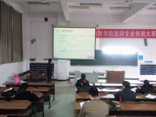 (通讯员 郭羽)为了提高体育学院教师的教学基本功,促进专业技能和教学技能的提高,适应教学改革与发展的需要,体育学院教师教学技能大赛决赛于12月14日上午举行,担任本次决赛的评委有学校教务处处长雷存喜、学校工会常务副主席姜宁、学校工会女工委员石清丽、院长唐吉平、党总支书记熊兴吾、副院长李志宏、党总支副书记郭羽、教研室主任舒宗礼、龚莹莹、张志辉、董喆、许进。
