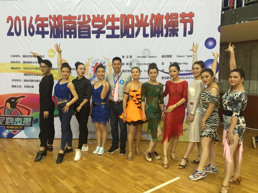 (通讯员 郭羽)由湖南省教育厅学生体育协会、湖南省体育局健身协会举办,湖南师范大学承办的2016年湖南省学生阳光体操节于5月27-28日在湖南师范大学举行,我校参加了体育舞蹈和健身健美两项比赛,其中健身健美代表队由霍赞东老师带队,有来自湖南省12个代表队共143名选手参赛,经过激烈角逐,我校学生获得3金1银3铜,体育舞蹈代表队由唐海鸥老师带队,有来自中南大学、湖南大学、湖南师范大学等47个代表队1000余名学生参加,我校学生在比赛中不畏强手,奋勇拼搏,一举获得了6金5银9铜的骄人战绩。