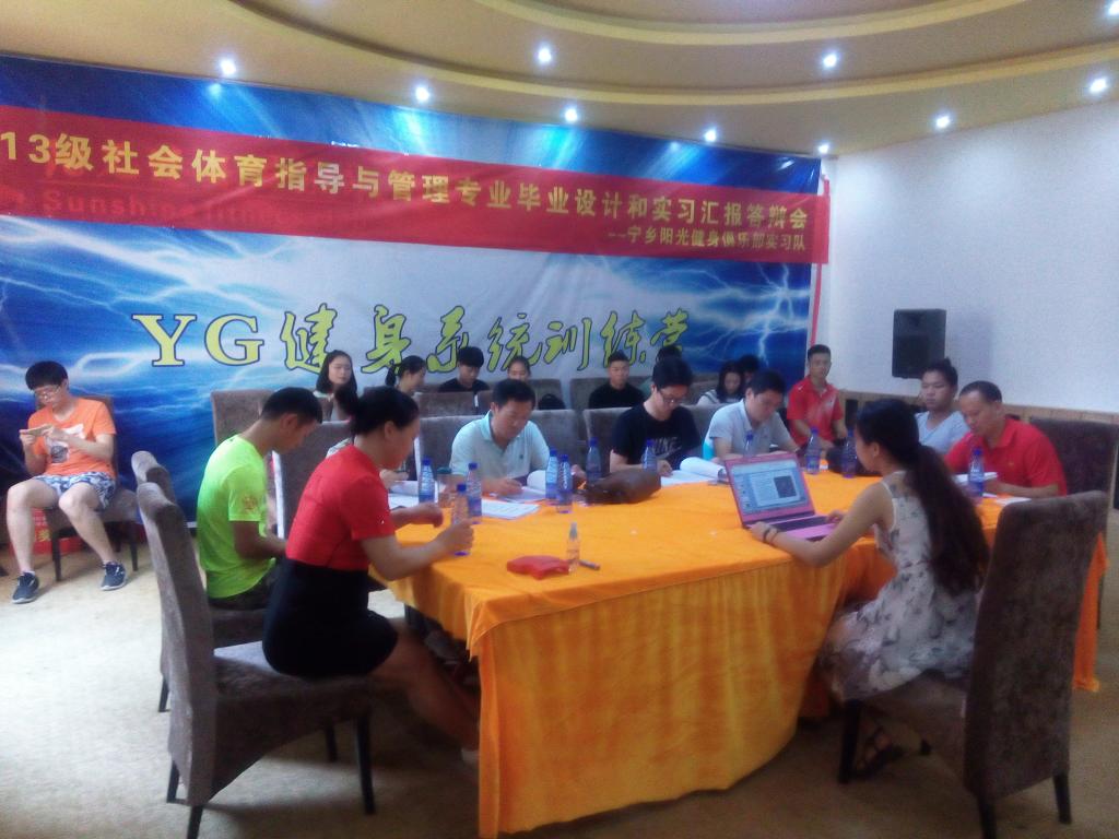 (通讯员 郭羽)2016年7月27日上午,湖南城市学院体育学院2013级社会体育指导与管理专业胡灿、范柳、罗莎、钱雅轲、蔡静、朱治谋、吉鼎钟、黄威浩、孙硕、廖向荣共10名毕业学生在宁乡阳光健身俱乐部会议室进行毕业设计答辩和实习答辩。俱乐部负责人邓泽华、陈密、体育学院副院长李志宏教授、党总支副书记郭羽、燕成教授、周振华教授、戴志鹏博士、舒宗礼博士、柳春梅博士等评委出席答辩报告会。
