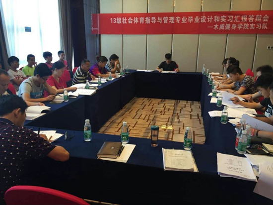 2016年7月27日在木威健身国职学院会议室进行了毕业实习总结和毕业设计答辩,体育学院的李志宏副院长、周振华教授、戴志鹏博士、杨清老师和木威健身国职学院的姚军总经理和廖婷经理参加了毕业实习总结和毕业设计答辩工作。8名实习生的精彩汇报给学院老师和公司领导留下了深刻的影响。