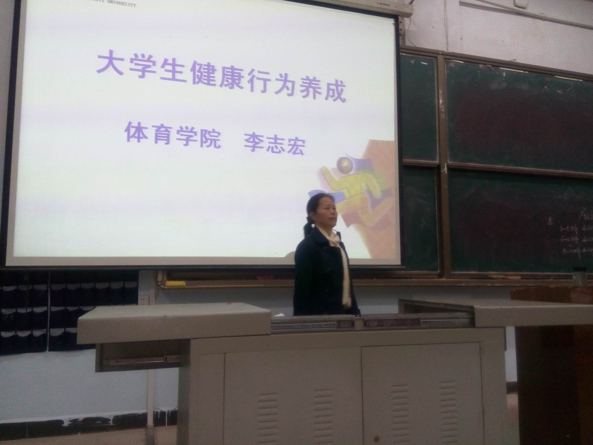 (通讯来源:运动人体科学教研室)11月4晚上7:00,第一教学楼107教室座无虚席,体育学院大一两百多名学生和运动人体科学教研室的全体老师们齐聚一堂,正在聆听学院副院长李志宏教授为他们作“大学生健康行为养成”专题讲座,讲座由体育学院党总支副书记郭羽主持。