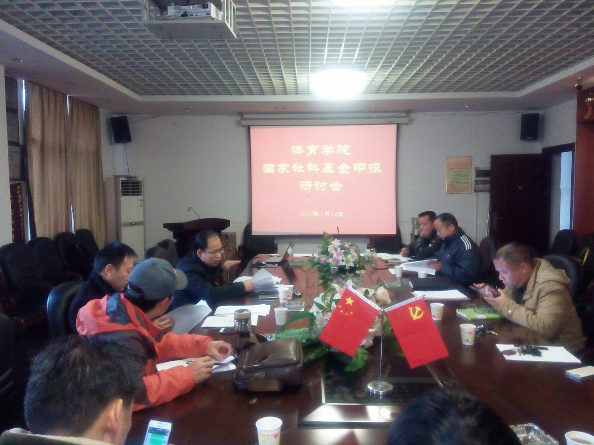 (通讯员 郭羽)1月14日上午,体育学院在会议室召开2017年度国家社科基金申报研讨会。会议由院长唐吉平教授主持,学校党委委员、副校长博士生导师何振教授、科技处副处长陈湘亮担当点评。党总支书记熊兴吾、副书记郭羽、副院长刘鸥、副院长李志宏及全体研究人员、学术委员会成员、访问学者、博士后以及进站博士后等参加了会议。
