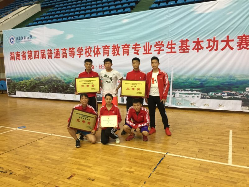 (通讯员 胡科)9月28日至9月30日,由湖南省教育厅主办的湖南省第四届普通高等学校体育教育专业基本功大赛在湖南师范大学举行。我校代表队通过两天紧张激烈的比赛,取得了优异成绩,获得了团体成绩三等奖、基础理论知识竞赛三等奖、运动技能竞赛三等奖,其中篮球排名全省第二。