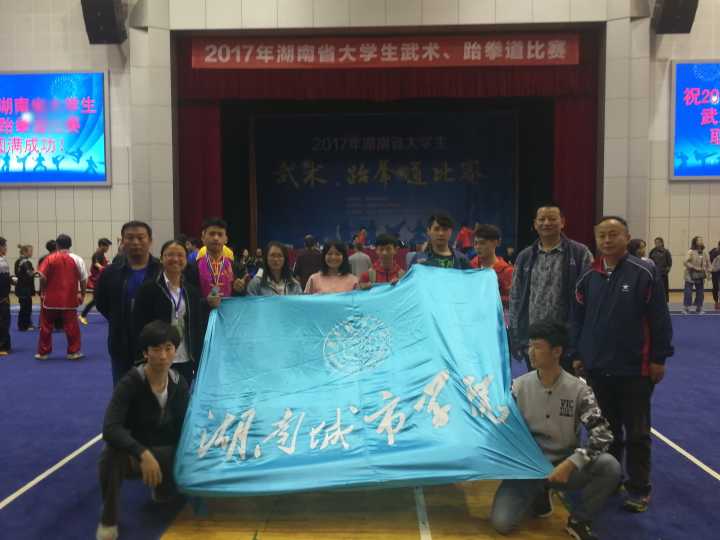 本次比赛,我校8名队员在教练廖玉美和彭智两位老师的带领下参加了学院组的比赛,这也是我校十多年后武术队再一次参加省级赛事。我校健儿利用业余时间训练,训练条件十分艰苦。他们本着初生牛犊不怕虎的胆识,在比赛中发扬了顽强拼搏的精神,在众多学院组的比赛中一举获得了3块银牌,1块铜牌的好成绩,圆满完成既定目标。刘宏杰:长拳银牌,传统软器械银牌;李思:南刀银牌,南拳第五名;刘明东:南拳铜牌;赵红:太极剑第四名,太极拳第五名;胡益凡:太极剑第四名,太极拳第七名;李先敬:太极拳、剑均第五名;黄兴灿:南拳、南棍均第六名;易圳:传统拳术第六名,长拳第七名。男子对练第五名。