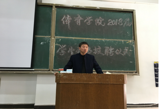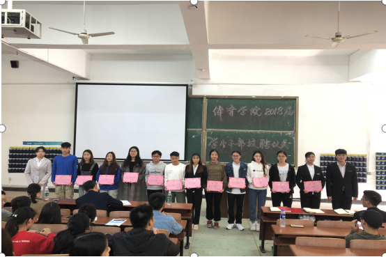 (通讯员 胡婷)为进一步加强学院学生干部队伍建设,增强学生干部队伍的凝聚力和战斗力,提高学生参与学校、学院管理工作的积极性、主动性,2018年10月23日中午,体育学院在一教学楼108举行了2018届学生干部授聘仪式。出席本次仪式的有体育学院党总支副书记何冬林、学工办副主任蒋佩云老师、团总支书记彭宇轩老师、辅导员罗颖老师和王敏老师以及学生干部主席团、部长团成员。