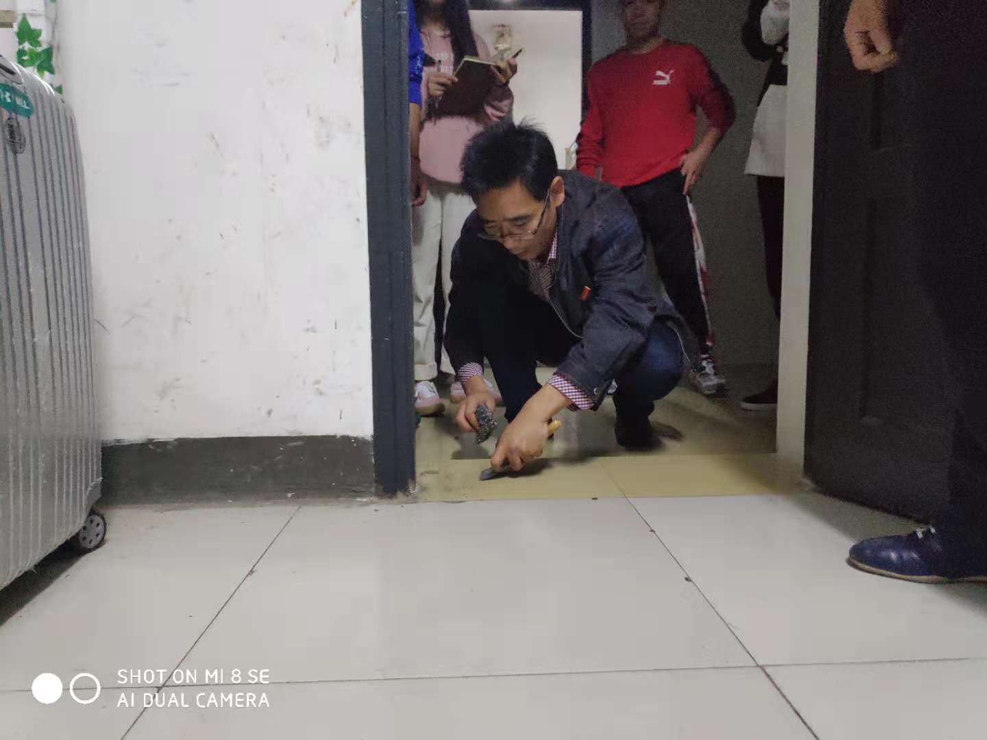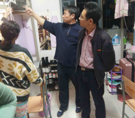 为真正将宿舍管理工作做到落实、落小、落细,10月28日下午17:30—22:00,学院副书记何冬林、副院长副书记郭羽带领辅导员、团学会主要干部从学生宿舍3栋一楼开始,按照“抓核心正学风、强管理促落实、重引导育氛围、树榜样立标杆”的工作思路,一间一间宿舍对内务、地面、墙面、天花板、凉台、厕所的卫生和书的摆放进行指导,特别是暑假装修时地面留下的水泥痕迹,很多学生都说弄不掉,副院长郭羽带着小铁铲和钢丝球,现场示范,将水泥痕迹擦干净,学生看到郭羽老师亲自动手,纷纷动手拿出小刀、钥匙、铁剪刀、抹布等,将宿舍地面擦洗得干净明亮。