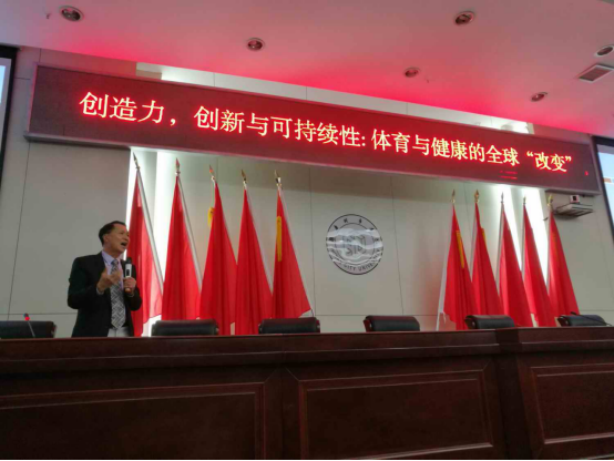 钱铭佳教授系全球健康社区基金会(GCH)创始会长、 金砖五国运动科学学会(BRICSCESS)联合创始人前会长、亚洲运动科学学会(ACESS)副总裁(全球事务和研究主管)HOPSportsInc。他讲座的主题是“创造力,创新与可持续性:体育与健康的全球‘改变’”。讲座伊始,钱铭佳教授首先通过视频向大家展示了“全球体育和健康的新方向与转型,互动科技和多煤体的多角色及应用”,通过对大量实践案例进行比较的方法,让大家思考如何让孩子动起来,喜欢动起来。