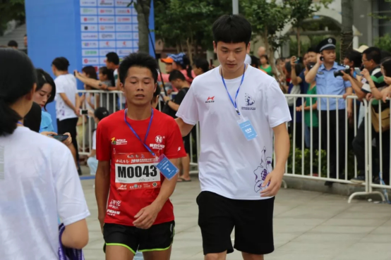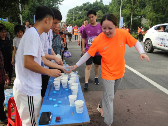 志愿者为参赛选手递上一杯水,为他们比赛“续航”