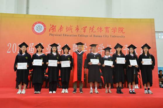 毕业典礼在庄严的国歌声中拉开序幕。院长胡科在致辞中向全体2022届毕业生致以衷心祝贺,并寄语同学们“厚德载物,心怀感恩”、“知行知止,自律自爱”、“甘于平凡、不甘平庸”。毕业生代表毛婉晴也从感怀、感恩等方面表达了自己的不舍和对母校、老师的祝福。副院长许进宣读了体育学院2022届毕业生获学士学位名单,副院长、大学体育教学部副主任欧岳山宣读了体育学院获省级优秀毕业生名单,院长胡科为获奖毕业生颁发了荣誉证书。