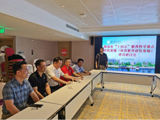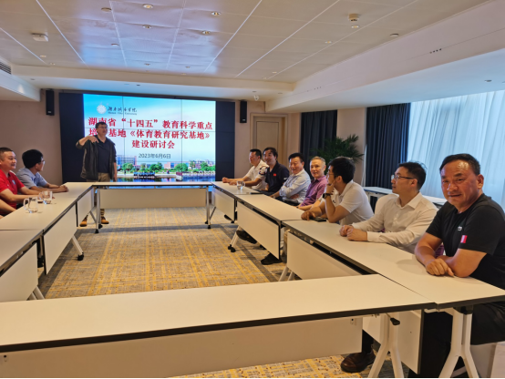 (通讯员 许进)2023年6月6日,湖南省“十四五”教育科学重点培育基地《体育教育研究基地》建设研讨会在我校举行。中国高等教育学会体育专业委员会常务理事、湖南省高等学校体育教学指导委员会副主任委员、博士生导师李艳翎教授,中国体育科学学会体育管理分会委员、中国社会学会体育社会学专业委员会委员、博士生导师金育强教授,全国体育硕士专业学位研究生教学指导委员会委员、教育部高等学校体育教学指导委员会委员、教育部首届全国中小学健康教育教学指导委员会委员、博士生导师汤长发教授,中国解剖学会运动解剖学专业委员会常务委员、中国生理学会运动生理学专业委员会委员、湖南省高等学校体育教学指导委员会委员、湖南师范大学体育学院院长、博士生导师郑澜教授,湖南省高等学校体育教学指导委员会委员、湖南工业大学刘亚云教授(原湖南工业大学体育学院院长),湖南省高等学校体育教学指导委员会委员、长沙师范学院体育学院院长陈捷教授,湖南省体育职院党委副书记、副校长彭庆文教授,湖南科技大学体育学院院长敬龙军教授、湖南工业大学体育学院院长范成文教授,湖南农业大学体育学院院长曹庆荣教授,湖南农业大学唐吉平教授(原湖南城市学院体育学院院长),湖南第一师范学院体育学院院长李梦龙教授,湖南财政经济学院体育学院院长刘伟教授、湖南文理学院体育学院院长毛致和教授,湖南文理学院刘锋教授(原湖南文理学院体育学院院长),邵阳学院体育学院院长陈日升教授出席会议。体育学院党委书记郭羽、院长胡科、副院长许进、大学体育教学部副主任欧岳山等参加会议。体育学院院长胡科主持会议。