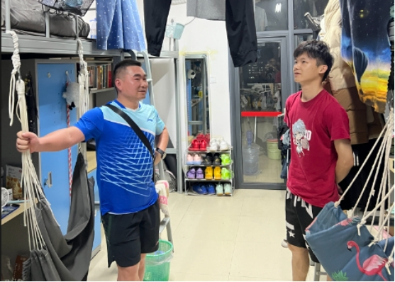 在走访大一、大二寝室时,班主任、辅导员对6人间的拥挤情况进行了解释,希望同学们能理解学校的实际情况,困难是暂时的,相比有些高校,我们学校的宿舍条件还是比较好的,寝室有空调,热水供应正常。看到个别学生玩游戏,对他们进行了批评教育,希望他们在校好好学习,刻苦训练,严格遵守学校的规章制度。