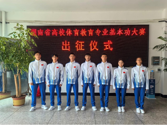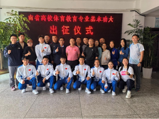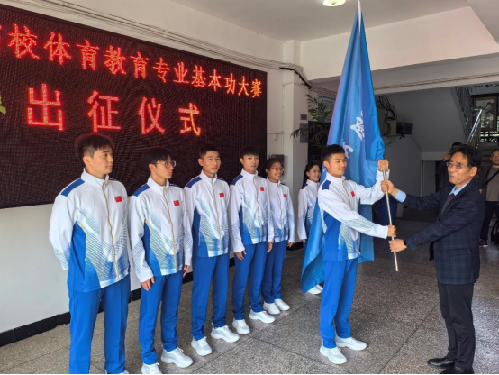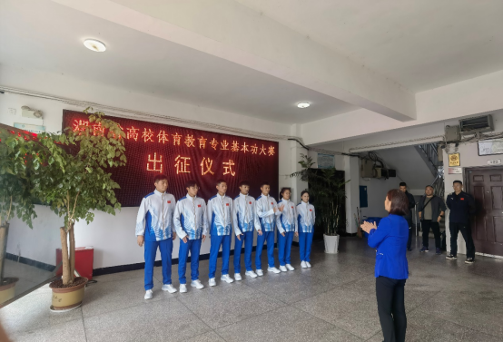 (通讯员 龚莹莹)2023年10月11日中午,湖南省第七届普通高等学校体育教育专业学生基本功大赛出征仪式在体育训练馆隆重举行。学院党委书记郭羽、院长李志宏、副院长许进、大学体育教学部副主任欧岳山、副书记匡艳群、体育教育系主任龚莹莹、全体教练员及7名参赛学生出席出征仪式。仪式由龚莹莹主持。