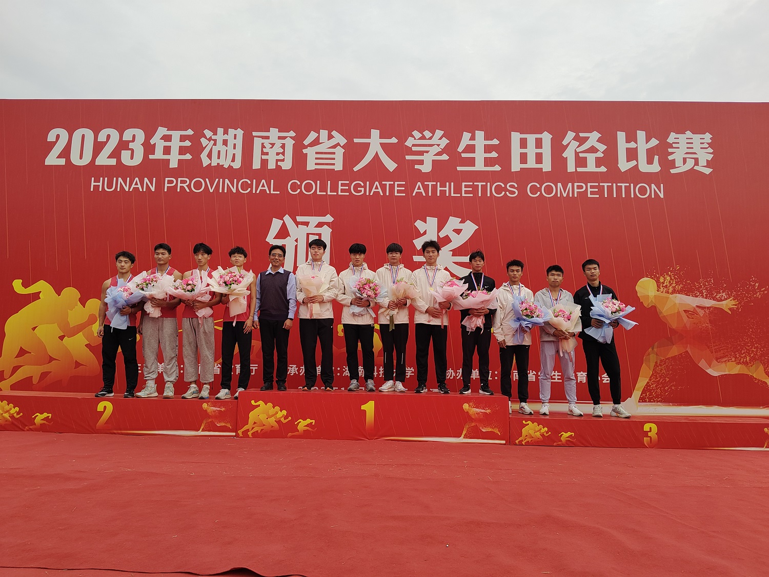(通讯员 郭羽)2023年10月22日—10月26日,由湖南省教育厅举办的2023年湖南省大学生田径比赛在湖南科技大学举行。本次学院组有16所高校的代表队参赛,其中有两所高校开办了运训专业。我校运动员在比赛中不畏强手,顽强拼搏,一举夺得了4金6银2铜,男女团体总分第五名的优异成绩,其中男子4X100米接力是我校升本以来首次获得这一项目的冠军。