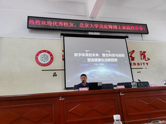 (通讯员 陈亮)2024年5月14日下午,体育学院邀请到了北京大学吴定锋博士(体育学院94级校友)来校进行学术讲座。学院全体教职工和部分学生共200余人参加了讲座,讲座由学院副院长许进主持。