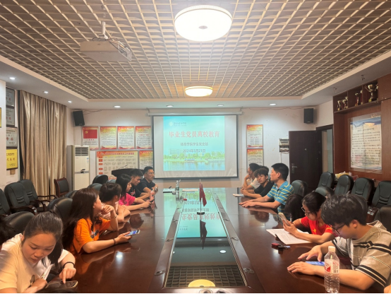 (通讯员 郭昊晴)为加强对毕业生党员的教育管理,提高毕业生党员的思想觉悟,2024年5月21日晚上,体育学院在训练馆会议室召开了2024届毕业生党员离校教育大会。学院党委书记郭羽、学生党支部书记郭昊晴、学工办主任邓荣以及毕业生党员参加会议。会议由邓荣主持。