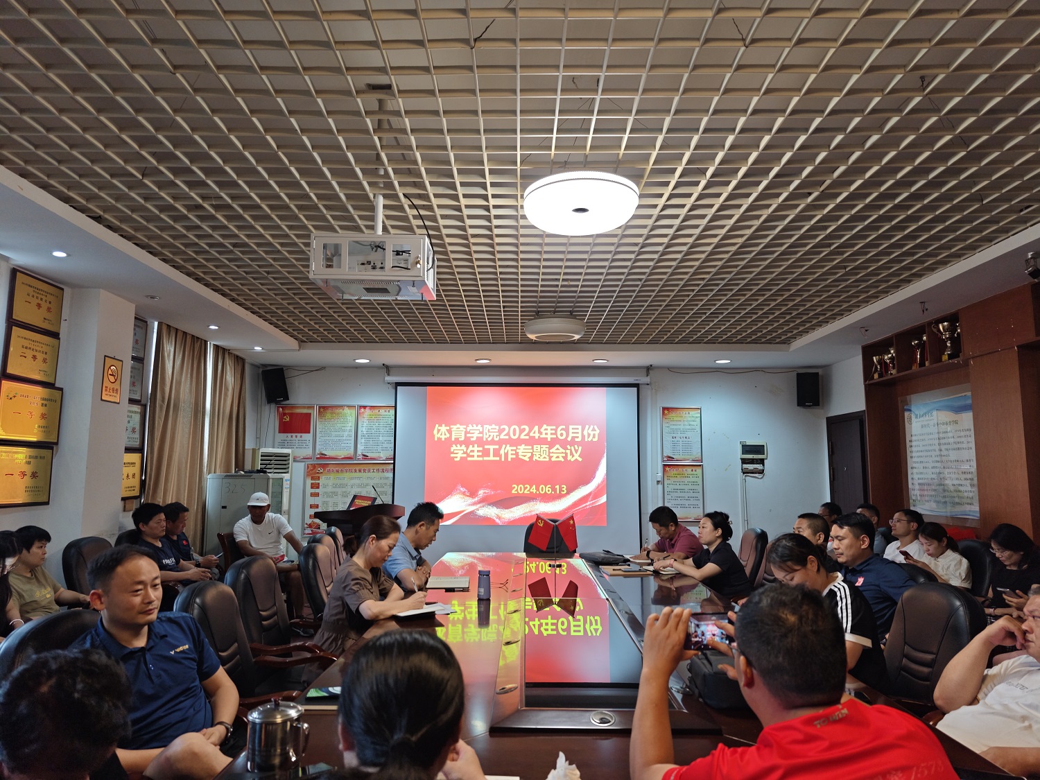 (通讯员 杨晶)2024年6月13日下午,体育学院在学院会议室召开了2024年6月份学生工作专题会议,学院党委书记郭羽,院长李志宏,副院长许进、副院长欧岳山、全体班主任、论文指导老师、大四专选班老师和全体辅导员参会,会议由院长李志宏主持。