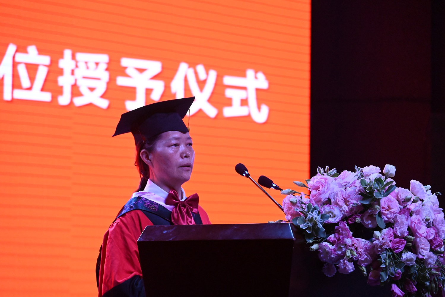 在欢快的乐曲中,获得学士学位的毕业们踏上红毯、走上主席台,导师们为他们一一拨正流苏、颁发学位证书。毕业生们手捧证书,脸上洋溢着自信灿烂的笑容,与全场师生共同分享这弥足珍贵的难忘时刻。学位授予仪式结束后,毕业生代表为主席台上的导师敬献了献花。