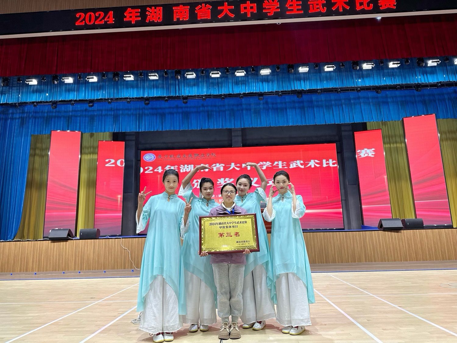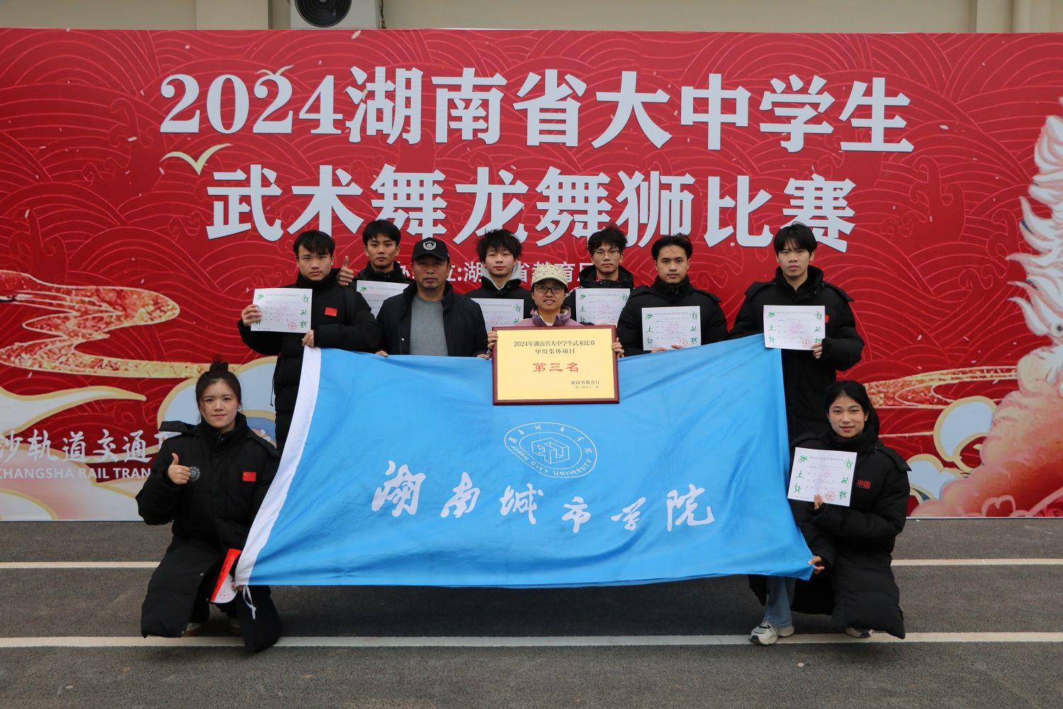 (通讯员 欧阳丽洁)2024年12月21日至23日,由湖南省教育厅主办、长沙轨道交通职业学院承办的2024年湖南大学生武术比赛在长沙轨道职业学院举行。我校武术队12名运动员在廖玉美、彭智两位教练的带领下奋勇拼搏,一举夺得1金1银1铜。