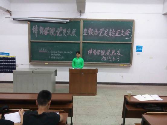 2015年6月3 日18点30分,体育学院学生党支部于一教308召开了学生党员发展大会。参加本次会议的有体育学院党总支副书记郭羽、学公办主任李伟、教工党支部副书记张力、教工党支部青年委员朱丹妮老师、全体学生党员以及7名发展对象。本次大会由体育学院团学会组织部干事解智港、王丹元主持。