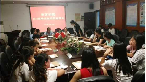 2016年6月15日晚上7:30点,体育学院2016届毕业生党员座谈会在学院会议室召开,参加座谈会的有体育学院党总支书记熊兴吾、党总支副书记郭羽、团总支书记张力以及2016届全体毕业生党员,座谈会由党总支副书记郭羽主持。