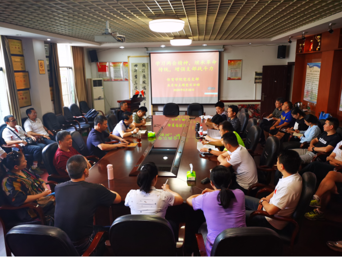 (通讯员 郭羽)2020年5月28日,体育学院开展了“学习两会精神,继承革命传统,增强支部战斗力”主题党日活动。上午8:30,全体党员在学院会议室集中,党总支书记龙文就本次主题党日活动进行布置安排并强调:理论学习要扎实开展,不能流于形式,学习要规范化,每次学习要明确2-3位同志作中心发言;主题党日活动开展要经常化,做到校内、校外相结合;每次党日活动要有一个鲜明的主题;每次党日活动要达到预期的效果。