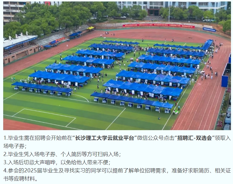 1.毕业生需在招聘会开始前在“长沙理工大学云就业平台”微信公众号点击“招聘汇-双选会”领取入场电子券;