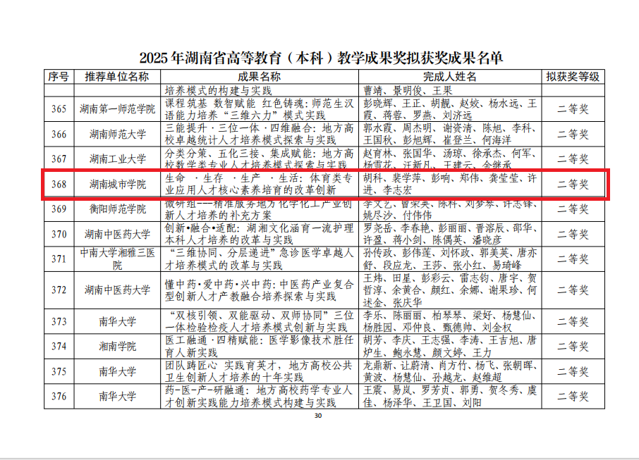 体育学院获2025年湖南省高等教育(本科)教学成果二奖