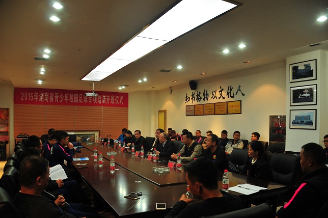 (本网讯) 11月5日 上午 ,2015年湖南省青少年校园足球中学骨干体育教师专项培训在我校隆重开班,来自常德、益阳、张家界和怀化四个地区的59名中学体育骨干教师齐聚一堂。我校党委副书记、副校长孟昭武、益阳市教委体卫科科长杨林以及校园足球培训办公室相关专家等出席开班仪式。开班仪式由教务处处长雷存喜主持。