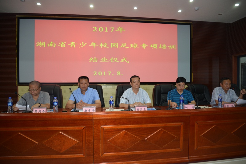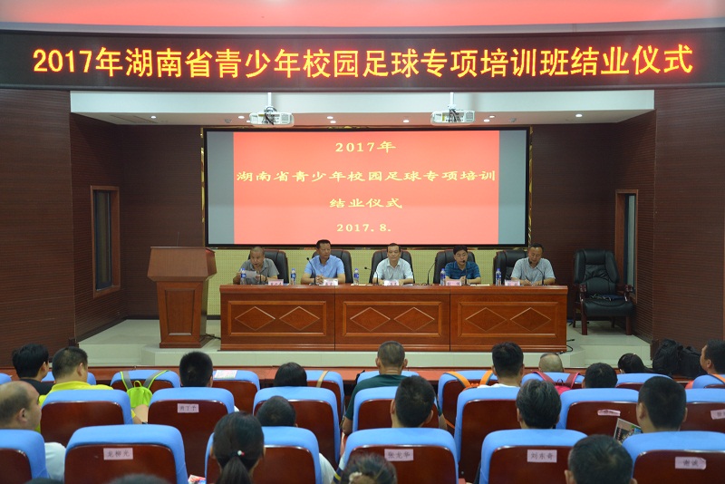2017年6月26日-7月6日,由湖南省青少年校园足球工作领导小组、省教育厅主办,我校承办的省青少年校园足球中小学骨干体育教师培训在我校举行,来自湖南省益阳、常德地区的80名中小学骨干教师参加了为期12天的培训。2017年7月6日上午9:00,培训班结业仪式在我校建规楼会议室举行。学校副校长雷存喜、教务处处长张伟、体育学院院长唐吉平、党总支书记熊兴吾、副院长刘鸥等出席仪式。仪式由体育学院党总支书记熊兴吾主持。